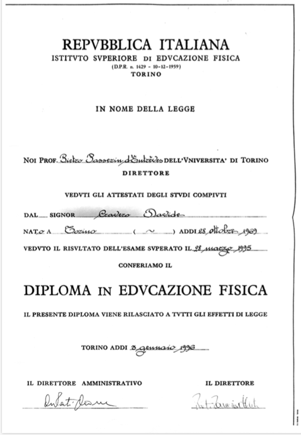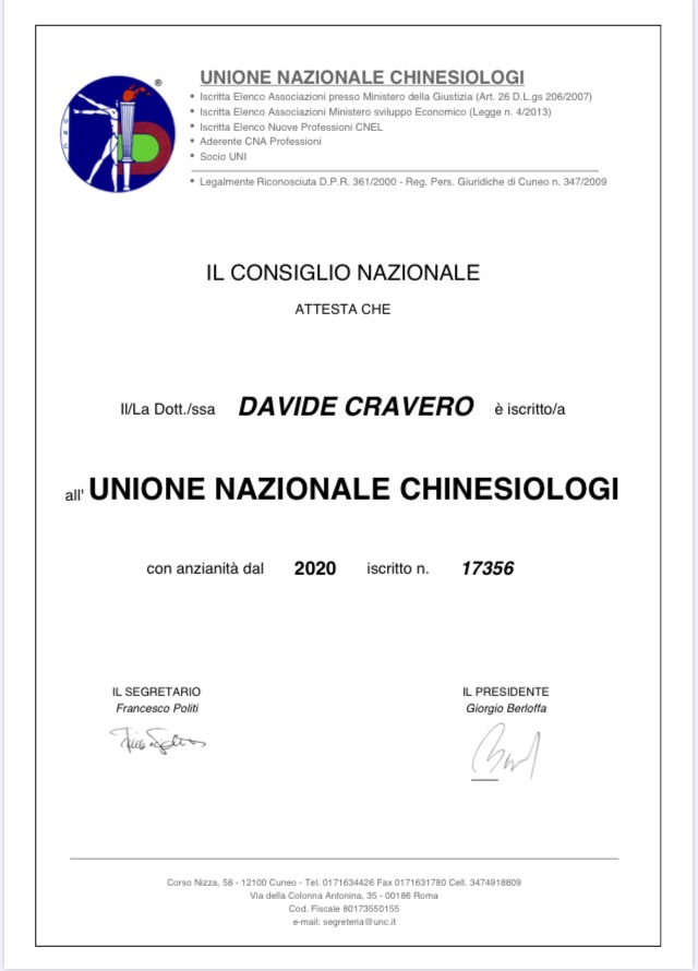 Sono iscritto all’Albo Nazionale dei Chinesiologi (tessera n. 17356) e, dal 2024, sono istruttore e atleta FIDAL dell’US Sanfront Atletica sonocietà storica del panorama cunese.
