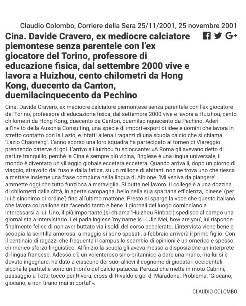 Dal Corriere della Sera , Claudio Colombo, Cravero Davide in Cina